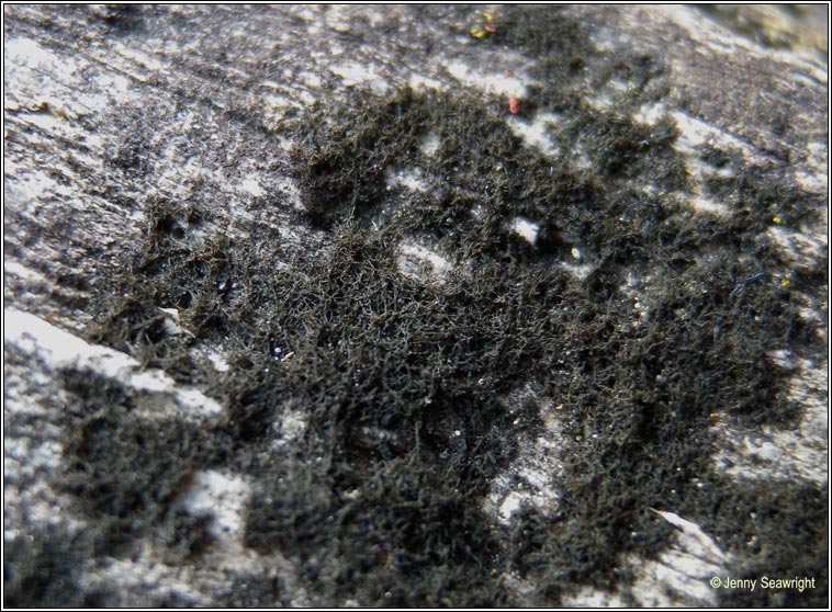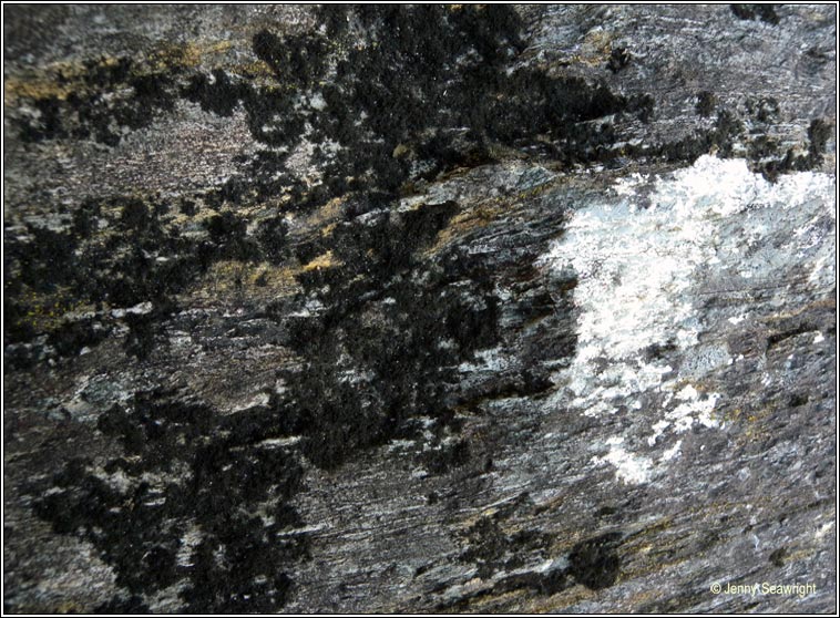 Species: Lichina confinis Photos: On coastal rock above HWM. Dunmanus Bay, Cork, Ireland The very small, bushy, blackish thallus is less than 5mm high and forms dense mats or loose cushions with many rounded branches. Spherical apothecia occur on the branch tips, the spores simple, ellipsoid, 12-18 x 10-15 µm. Found on well-lit sheltered coastal rocks above the high water mark. Chemical reations negative. Similar: Lichina pygmaea. Larger, occurs below HWM |