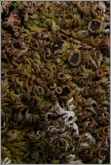 Species: Anaptychia runcinata Photos: On coastal rocks. Toormore, Cork, SW Ireland. The narrow radiating lobes are greenish-brown when wet but become dark reddish-brown when dry. Under-surface with scattered rhizines. Dark apothecia with crenulated paler margins are frequent. Asci 8-spored, the spores brown, 1-septate, 30-36 x 15-18 µm. Common on coastal rocks to sea-level and sometimes also found inland in western areas on rocks, walls and occasionally trees. K-, C+ pale yellow |