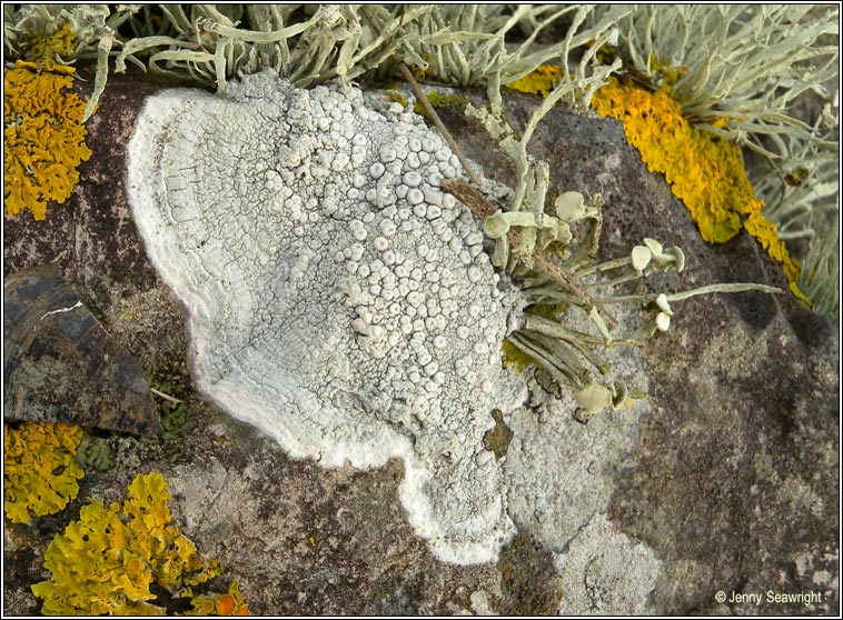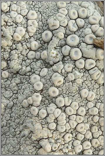 Photos: On coastal rocks, Toormore area, Cork, SW Ireland. Thick, warted, creamy-white or greyish thallus. White prothallus with zoned 'growth-rings' near thickened margins. Very fertile, numerous pinkish apothecia usually with cracked white pruina. The asci are 2-8 spored, spores simple, 45-75 x 25-45 µm. Common in both coastal and inland areas on hard, siliceous rocks and occasionally found on trees and weathered wood. Can be variable. Cortex K-, C- (or C+ yellow), UV-. Apothecia C+ red, KC+ red, UV+ white Associated lichenicolous fungi include Rhizocarpon ochrolechiae, Sclerococcum parellaria, Sphaerellothecium araneosum |