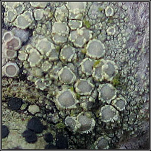 Species: Lecanora confusa Photos: Yellow-grey to greenish, granular or granular-areolate thallus with +/- abundant apothecia. Discs pale yellow-green, sometimes pinkish-brown. The margins are paler than the thallus, initially crenulate, rarely becoming excluded. Widespread on fence rails and twigs of smooth-barked trees e.g Ash, Blackthorn. Thallus K- (usually), C+ orange, P- Similar: L. symmicta. Discs more crowded, margins often excluded |