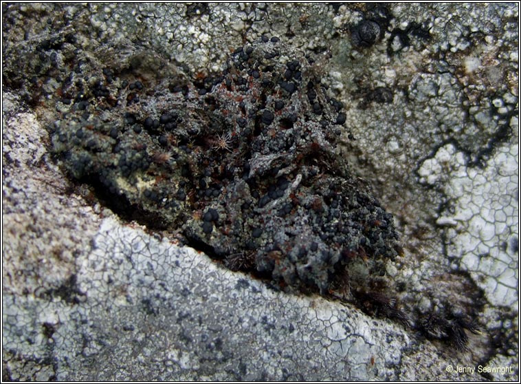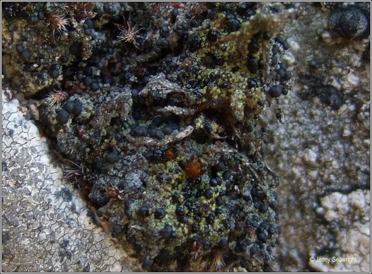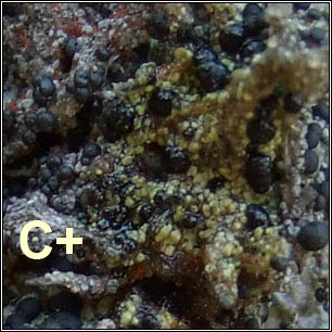 Photos: Ballingeary, Co. Cork, SW Ireland. C+ yellowish-orange Thallus of scattered or confluent, +/- globose whitish, bluish-grey or grey-green areoles with yellowish tinge. Black or blue-black, immarginate apothecia are convex to +/- globose. Pycnidia absent. Occasional, on mossy, acidic rocks and trees in upland and coastal areas. Most frequently recorded from the north and west of Ireland. Thallus K-, C+ persistent orange, KC+ persistent orange, P- Similar: Micarea lignaria var lignaria. K-, C-, KC-, P+ red |