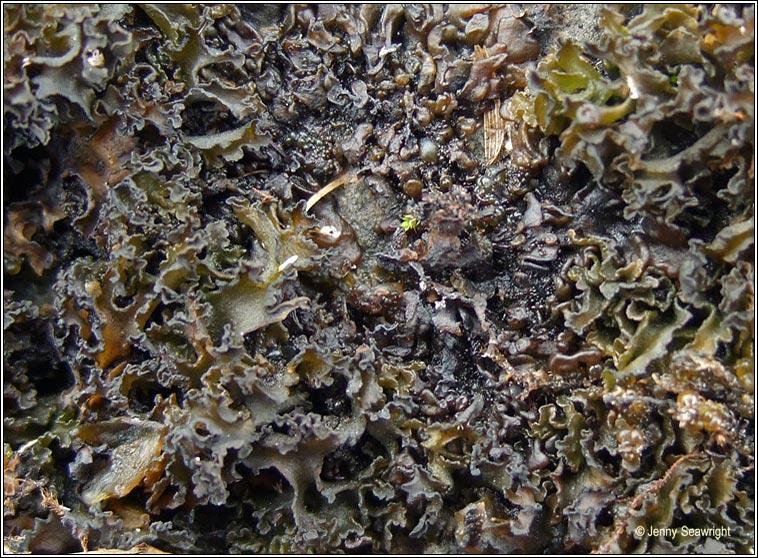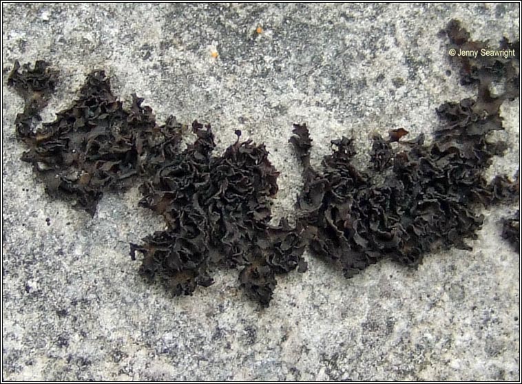 Species: Lathagrium cristatum (Collema cristatum) Photos: On limestone in the Burren, Co. Clare and on wall, Foynes, Co. Limerick, Ireland. Round, semi-circular or irregular thallus, centre often disintergrating with age. Lobes thinnish, radiating, convoluted, margins wavy, entire or incised. Upper surface dark olive-green to black, lower with white tufts of hapters. Sessile or stalked apothecia with even margins, usually crowded, +/- marginal, but sometimes absent. Common throughout Ireland on hard calcareous rocks, mortar and tombstones. Chemical reactions negative. |