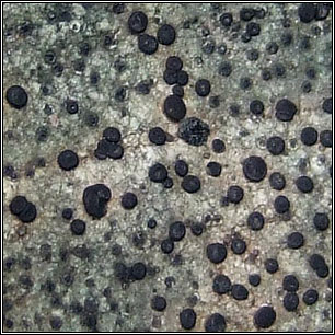 Species: Rhizocarpon lavatum Photos: On stones in wall. Gougane Barra, Cork, SW Ireland. Grey to pale ochre-brown thallus, greener when wet or shaded, smooth or cracked. Prothallus weak or absent. Apothecia +/- flat, discs black, not pruinose, thick persistent dark-brown margins. Asci 8-spored, spores muriform, colourless, 30-40 x 14-18 µm. Occurs on damp siliceous rocks near upland streams and lake edges. Chemical reactions negative. Similar: Rhizocarpon reductum. Usually K+ yellow, P+ orange. |