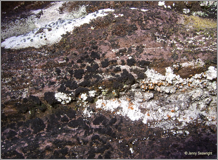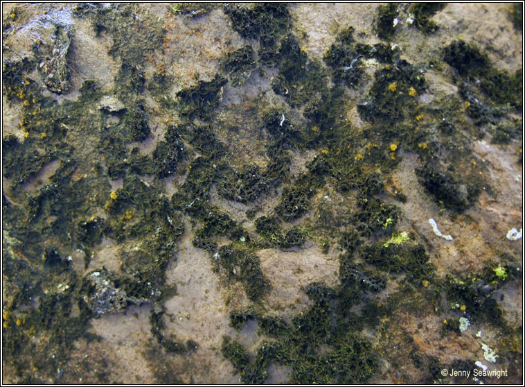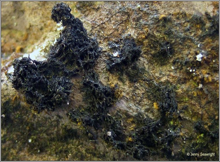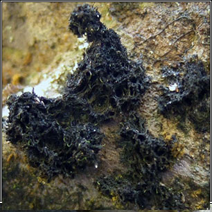Species: Racodium rupestre Photos: Below overhang, acidic rock. Gougane Barra, SW Ireland. The thallus forms small patches of dark brown or black, +/- felted filaments. Very similar to Cystocoleus ebeneus but the mycobiont hyphae are straight and not entwined or contorted. Can be locally common in upland areas on shaded, humid, +/- vertical siliceous rocks. Also found below overhangs where it is sheltered from direct rain. Chemical reactions negative. Identification is uncertain, photographs are probably of the cyanabacteria Stigonema |