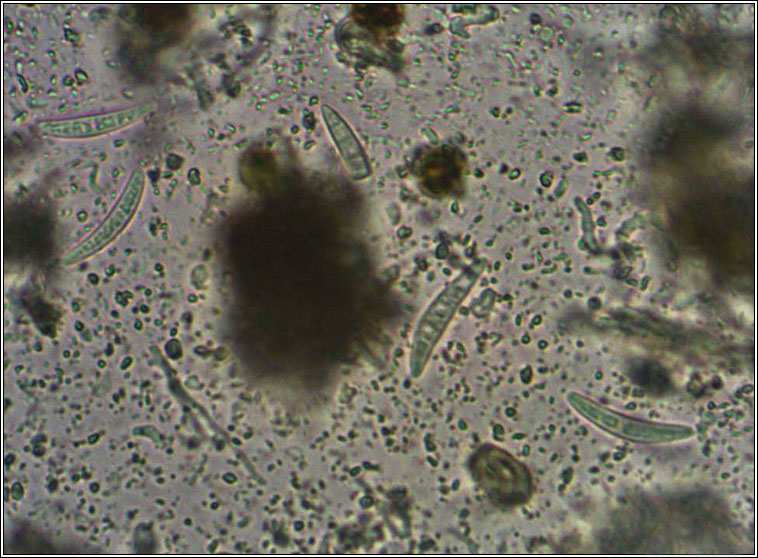Order: Arthoniales Family: Roccellaceae Species: Enterographa hutchinsiae Growth type crustose.Photo left: On bark. Droum Wood, Co. Cork, SW Ireland. Thick or thin dark grey to dull olive-green or brownish thallus often forming mosaics divided by black prothallus. Normally fertile with often branched lirelliform or comma-like apothecia, sometimes with whitish margins. Asci are 8-spored, the spores straight or +/- curved, 4-6 septate, 24-28 x 4-5 µm. Micro photos below. Chemical reactions negative. Usually on shaded, damp, often vertical siliceous rocks in steep, wooded ravines and beside streams and loughs. Occasional on exposed tree roots and the trunks of old trees. Similar: Enterographa crassa. Usually on bark, smaller apothecia. |