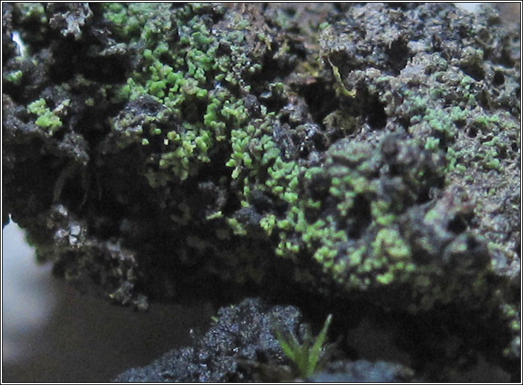 Species: Agonimia tristicula Photos: Glengarriff woods and mortared wall, Co. Cork, SW Ireland. Photo left and immediately below identified by Andy Acton Thallus of tiny, flattened green squamules, greyish-brown when dry, with minute papillae on upper surface. Very small, black, barrel-shaped apothecia are often half-hidden amongst the squamules. Usually over moss on mortared walls and on calcareous soils. Occasionally on bark of base-rich trees; Acers, Elm and Ash. Similar: Agonima octospora is corticolous, with smaller, less flattened squamules. |