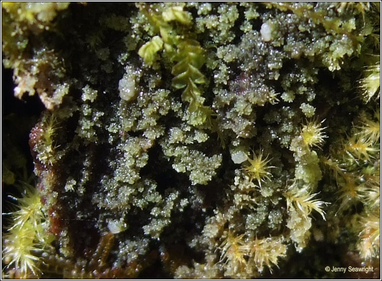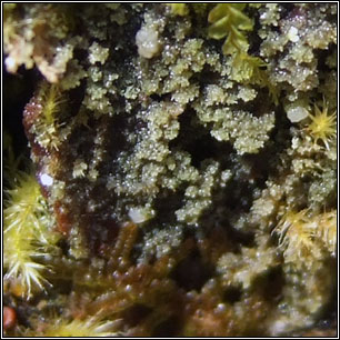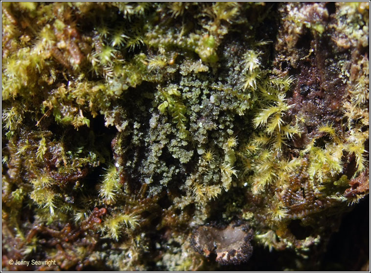 Species: Bacidina celtica (Bacidia squamellosa auct. brit) Photos: Glengarriff woods, Co. Cork, SW Ireland. N. B. Algae size not checked so photographs are possibly sterile Micarea prasina s. lat, photobiont cells all <8 µm diam. Pale greenish thallus, comprised of delicate, shiny, deeply-cut squamules that resemble branched isidia. Photobiont cells 5-12 µm diam. Apothecia are usually absent, when present and mature they are similar to those of Dimerella lutea. Occurs on the bark of deciduous trees in damp, oceanic woodlands, often overgrowing moss or liverworts. Similar: Sterile, isidiate morphs of Micarea micrococca |