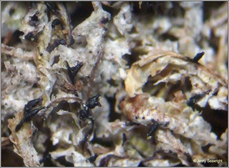 Species: Micarea botryoides Photos: Over moss, Glengarriff woods, Co. Cork, SW Ireland. Identified by Andy Acton Thallus usually pale to dark green, straw-coloured in deep shade, thin or granular. Abundant stalked pycnidia, black, usually with white tips. Apothecia are infrequent, spores 0-3 septate. Chemical reactions negative. Occurs under shaded overhangs on rocks, roots and at tree bases, also found overgrowing moss and liverworts. |