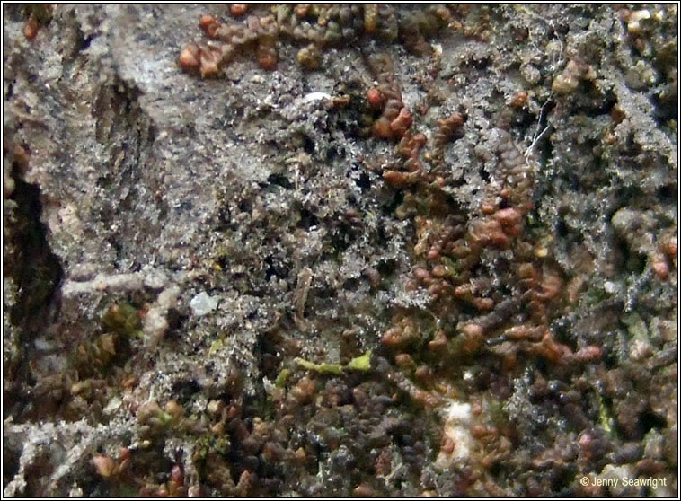 Species: Porina coralloidea Photos: Glengarriff woods, Co. Cork, SW Ireland. Smooth dark greyish thallus, often with pink, purple or brownish tinge. Crowded, usually simple, cylindrical isidia. Immature isidia with paler, pointed tips. Scattered, half-immersed, black perithecia, the spores 9-11 septate. Infrequent, an 'old forest' indicator species usually found on the bark of mature to very old Oak. Also recorded from Ash and Beech. Similar: Jamesiella anastomosans has pale-grey, isidia-like structures containing a trebouxioid photobiont. |