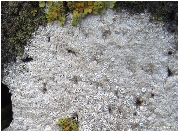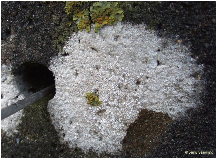 Species: Pyrenodesmia variabilis (Caloplaca variabilis) Photos: On concrete. Aughinish, Co. Limerick, W Ireland. Grey to greyish-brown, areolate, rounded thallus, sometimes with a dark prothallus. Sessile apothecia with grey-blue pruinose black discs, the spores 14-16 x 7-9 µm, and the septum 2-3 µm wide. The epithecium is pale, K+ purple. Thallus K-. Found on nutrient-rich calcareous rocks, walls and the horizontal copings of walls and bridges. |