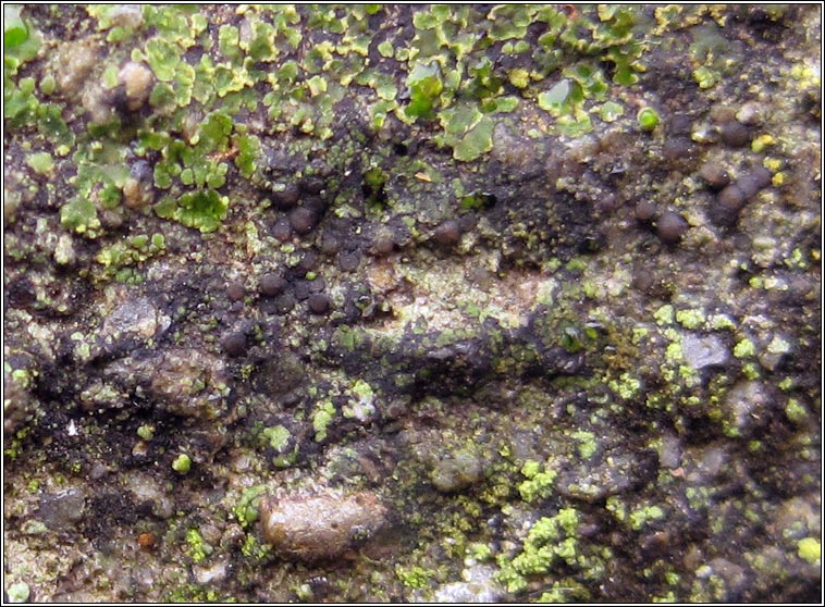 Order: Lecanorales Family: Porpidiaceae Species: Clauzadea monticola Growth type crustose. Left identified by J DouglassPhotos: On concrete walls. Co. Cork, SW Ireland. Thallus dark grey or grey-brown, +/- immersed, prothallus absent. The sessile, convex black apothecia become reddish when wet but are never pruinose. Can resemble perithecia when dry. Hypothecium is reddish-brown. Asci 8-spored with simple, colourless, thin-walled spores, (6-)8-12(-14) x 4-9 µm. Microscope photograph below. Chemical reactions negative Common and widespread on calcareous rocks and mortared walls. Similar: Lecidella stigmatea: Thallus K+/- yellow. Hypothecium colourless or pale yellow. Sarcogyne regularis: Pruinose discs reddish when wet. Multi-spored ascus. |