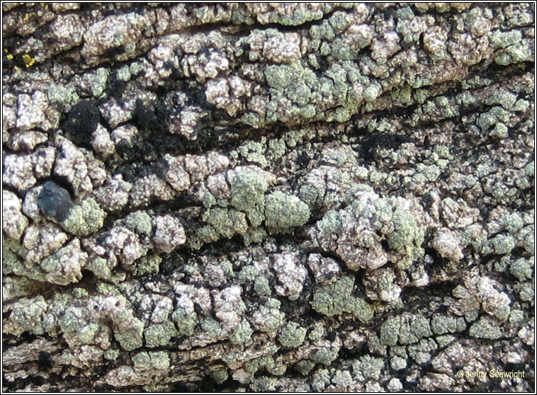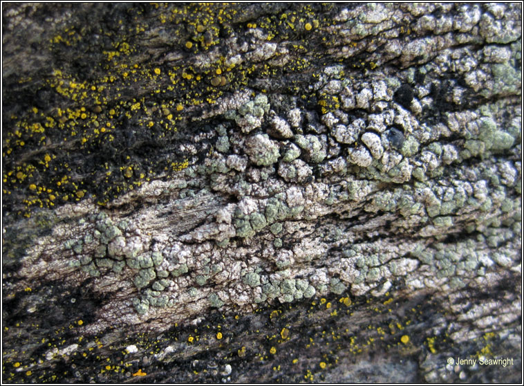 Species: Lecidella scabra Photos: Allihies, Co. Cork, SW Ireland. Thin or roughly granular grey thallus, often tinged greenish. Delimited soralia become confluent, bluish-green or yellow-green, grey-green when rubbed. Soralia reduced when apothecia present. Common on acidic walls and rocks. Also found on slightly base-rich rocks and occasionally on weathered or dusty wood and tree bases. |