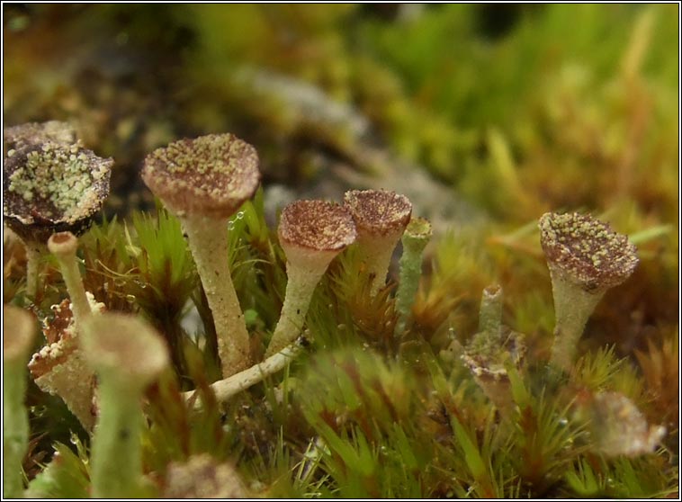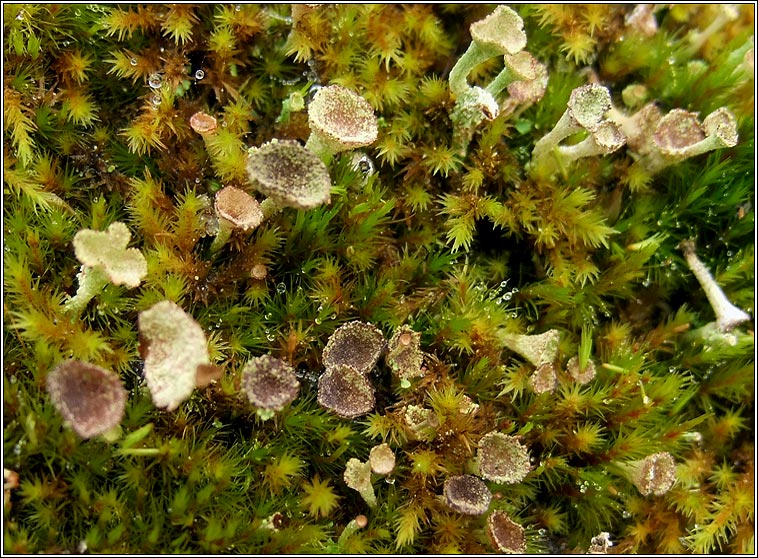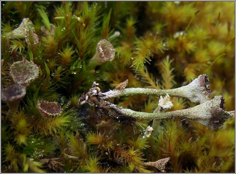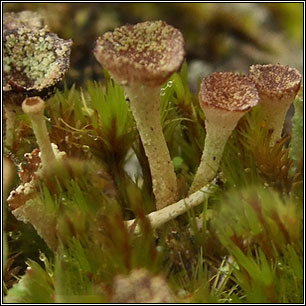 Species: Cladonia grayi sens lat Photos: In acid soil among rocks. Ballingeary, Cork, SW Ireland. Chemical results: K-, C-, KC-, P +/- red. Medulla UV + blue One of a number of chemotypes within the Cladonia chlorophaea aggregate Basal squamules inconspicuous and soon disappear. Podetia usually unbranched and with brownish tinge, granulose-corticate but usually without large soredia. Found in more acidic habits than C. chlorophaea s.str. The aggregate includes Cladonia asahinae, C, cryptochlorophaea, C. grayi, C, merochlorophaea and C. novochlorophaea but excludes Cladonia chlorophaea s. str. |