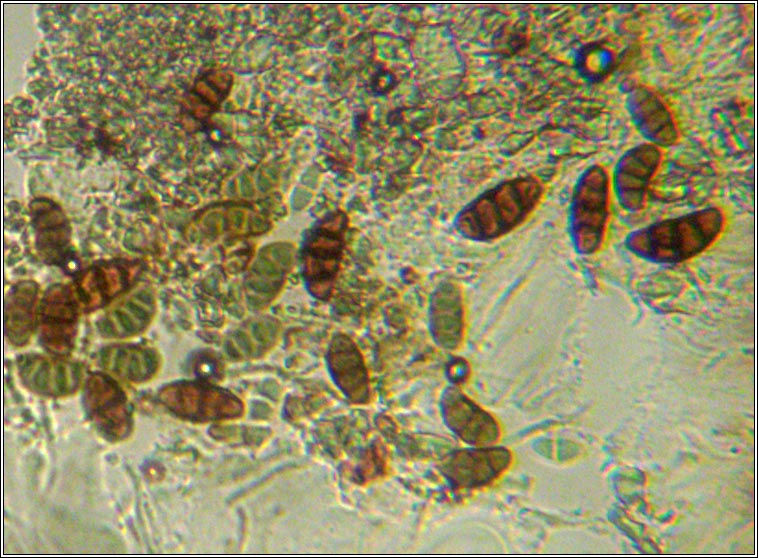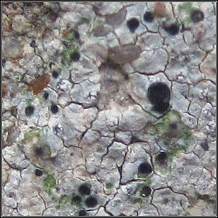 Species: Diplotomma alboatrum Very variable, the rather thick white, pale or dark grey thallus is smooth, cracked or granulose. Apothecia are flat becoming convex, the black discs often pruinose, thalline margin sometimes present. Asci 8-spored, spores brown, 1-3 septate becoming submuriform or muriform when mature, (11-)15-20(-30) x (6-)8-10(-17) µm. Micrograph below. Chemical reactions and UV negative. On basic or calcareous rocks, stonework and mortar, occasional on nutrient-enriched, basic-barked trees and worked timber. Similar: Diplotomma pharcidium is rare on smooth nutrient-rich bark. Considered to be possibly synonymous with D. alboatrum |