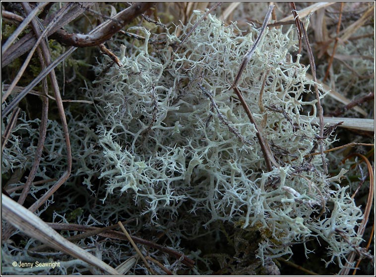 Species: Cladonia portentosa Photos: On wet heath near bog. Ballingeary, Cork, SW Ireland. Variable. Primary squamules absent. Very branched, whitish to green-grey and forming loose compact tufts. Axils often perforate. Branching mainly trichotomous, can be dichotomous at ends. Branchlet tips spreading in all directions. Common and widespread on heaths, peaty moorland and among dunes. K-, KC+ yellow, P- Similar: Cladonia ciliata and Cladonia arbuscula |