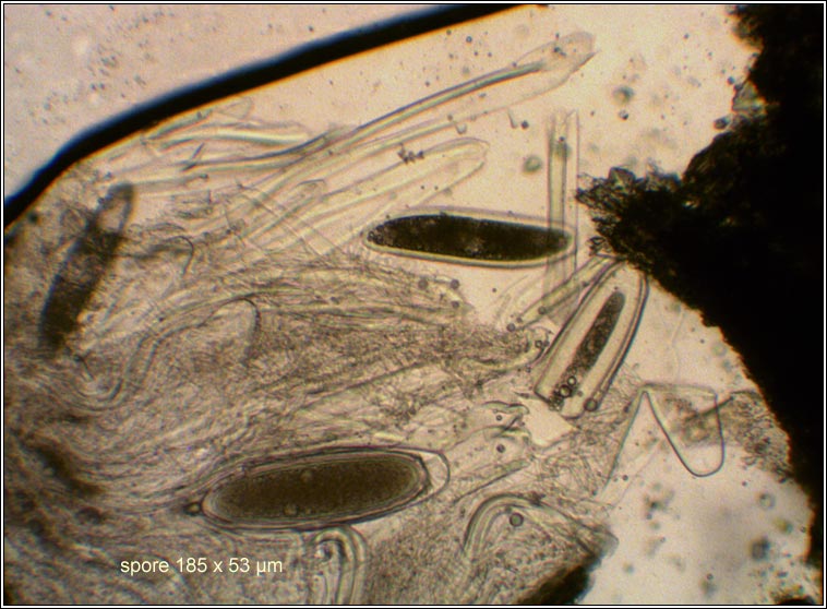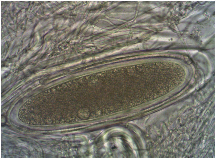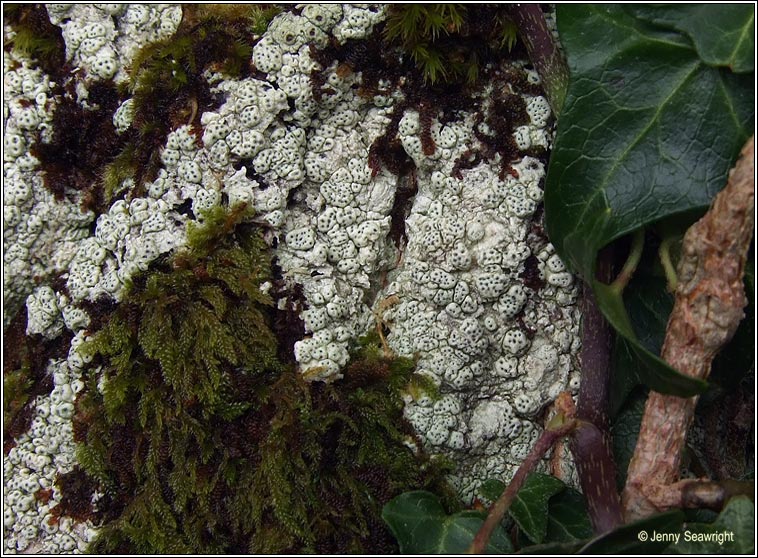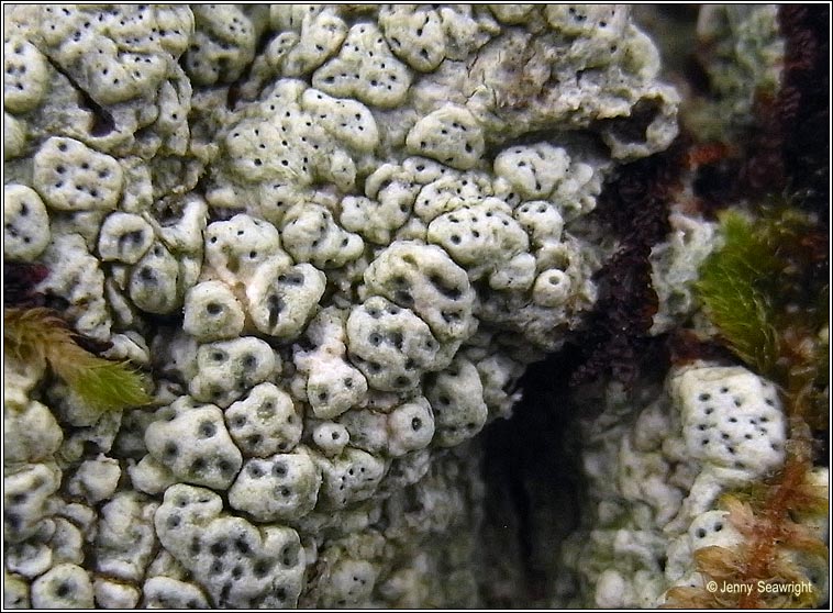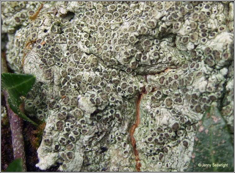 Species: Pertusaria pertusa Photos: Gougane Barra, Cork, SW Ireland. Thick, slightly cracked greenish-grey thallus, often with conspicuous zoned margin. 3-7 apothecia produced from each wart-like protuberance. Asci usually 2-spored, spores (120-)145-230(-330) x 40-90 µm. Spore wall 7-15 µm thick. Microscope photos below. K+ yellow, C-, KC+ yellow or yellow-orange, P+ deep orange, UV+/- pale orange. Common on tree bark, occasionally found on rocks. It is often associated with Pertusaria hymenea. (K-, C+ yellow) Similar: P. leioplaca. K+ yellow, C- but asci (3-)4(-6) spored |
