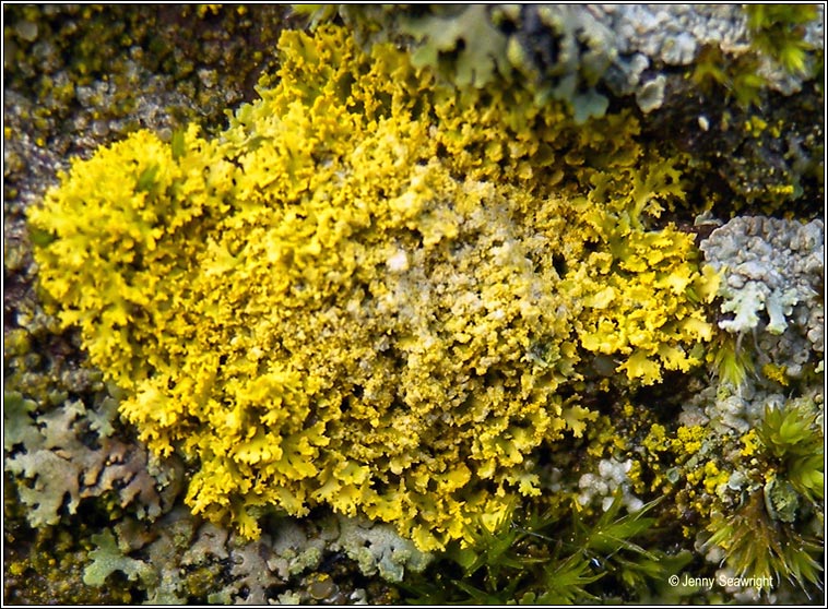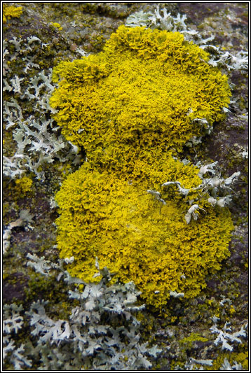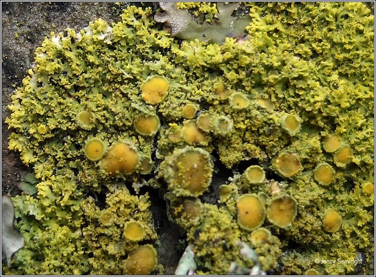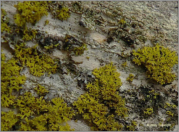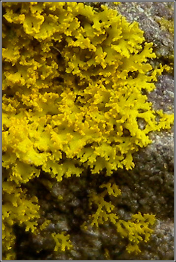 Photos: On rock and tree trunks. Co.Cork and Co.Kerry, Ireland. Tufted or layered minute yellowish lobes, whitish below with scattered simple white rhizines. Deeply incised with soredia on margins and sometimes spreading over thallus. Apothecia are infrequent, dirty-yellowish with roughened margins. Found on nutrient-rich bark, fence posts and occasionally on rocks. Rapid coloniser, most records are from the south of Ireland but it appears to be spreading rapidly. K- or K+ dirty-brown Similar: Xanthoria candelaria K+ crimson / purple |
